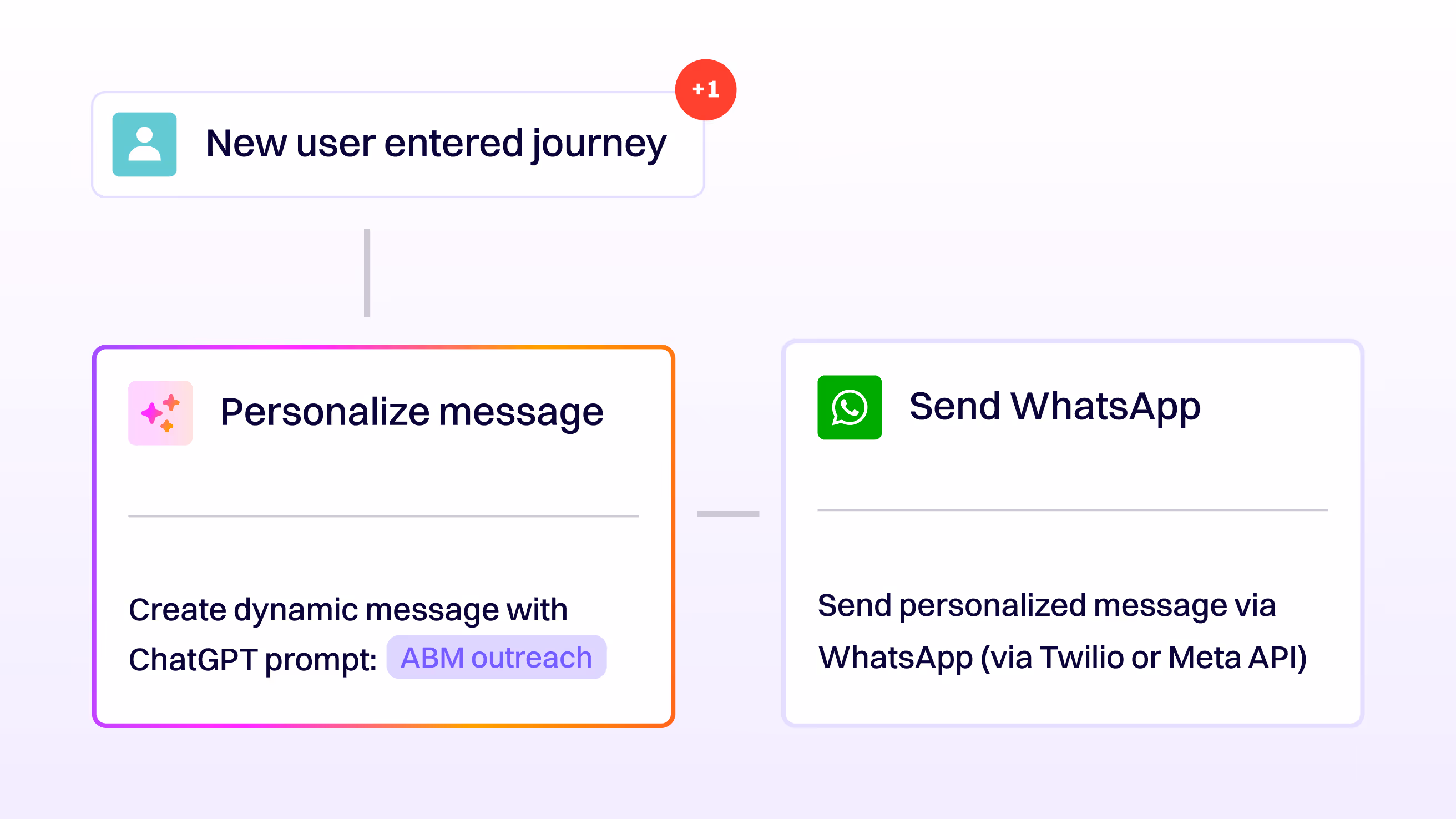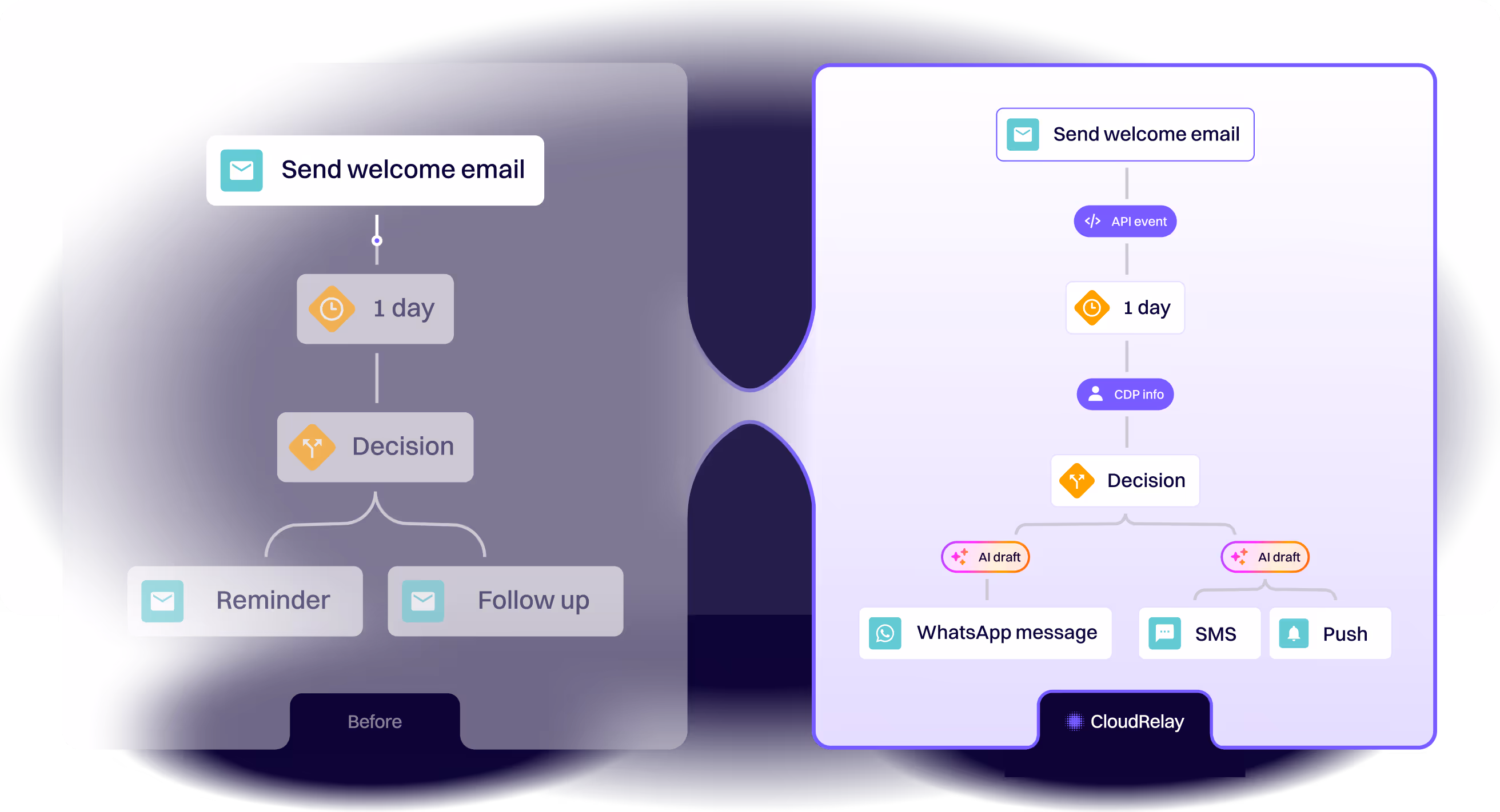 Using data or click behavior from user interactions in your journeys always means you’re working with a 15 minute delay. With CloudRelay, you can change flows based on third-party input from, for instance, LLMs or even credit check tools.